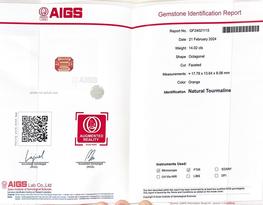AIGS Certified Natural & Unheated Orange Tourmaline Gemstone -Afghanistan